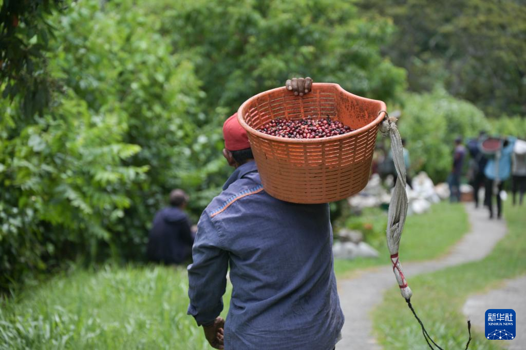 2月19日,在位于巴拿马奇里基省博克特地区的彼德松家族庄园内,一名工人在搬运刚采摘的咖啡豆。新华社记者 陈昊佺 摄