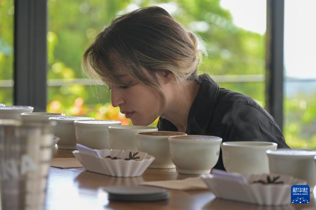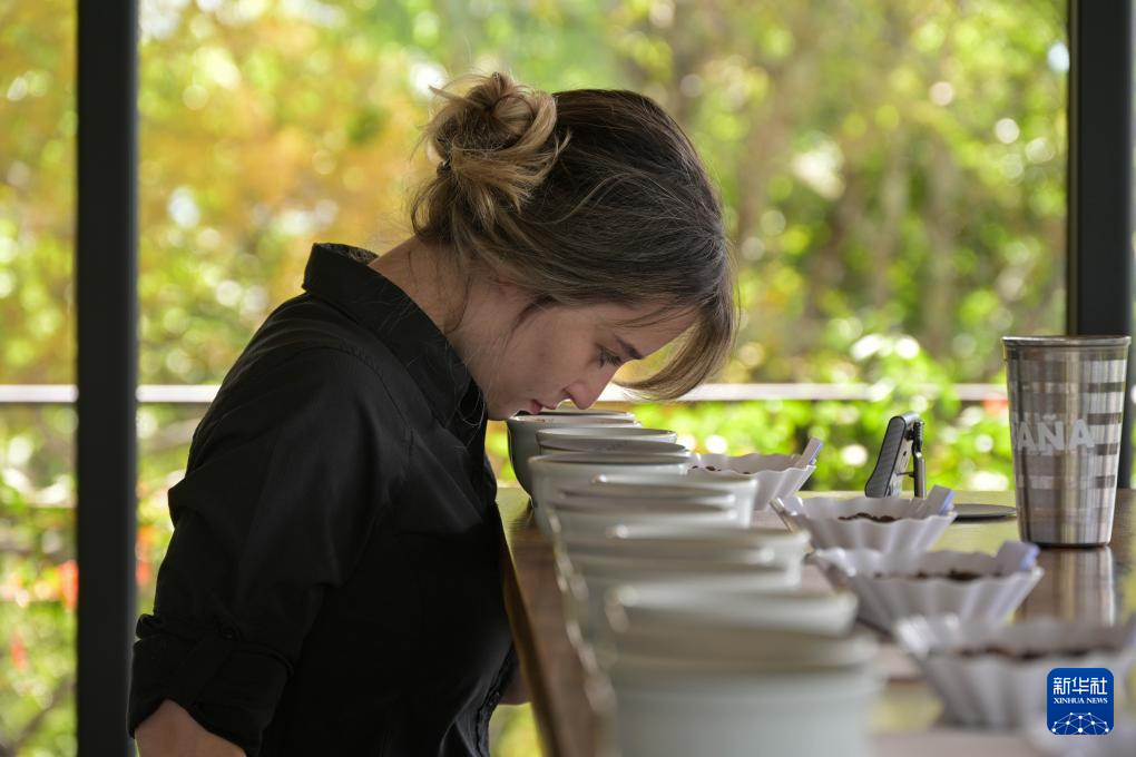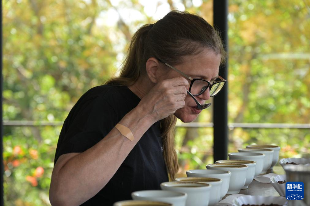 2月20日,在位于巴拿马奇里基省博克特地区的彼德松家族庄园内,庄园市场营销负责人蕾切尔·彼德松在进行杯测。新华社记者 陈昊佺 摄