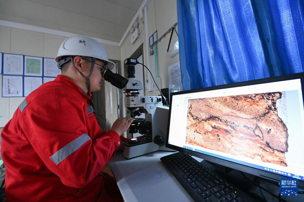 3月3日,科研人员在深地塔科1井用显微镜研究地底深处取上来的岩屑。新华社记者 李响 摄
