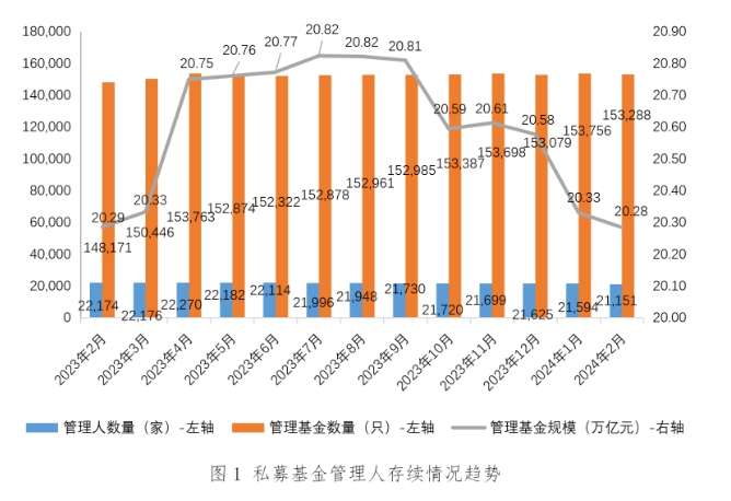 中国基金业协会最新发布的数据显示,2024年2月,新备案私募基金数量780只,新备案规模283.54亿元。截至2月末,存续私募基金管理人21151家,管理基金数量153288只,管理基金规模20.28万亿元。