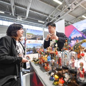 3月5日,参观者(左)在德国柏林举行的柏林国际旅游交易会中国展区了解面塑技艺。新华社记者任鹏飞摄