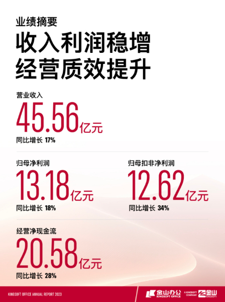 3月20日,金山办公公布2023年报。2023年,金山办公实现营业收入45.56亿元,同比增长17.27%;归属于母公司所有者净利润13.18亿元,同比增长17.92%;归属于母公司所有者扣除非经常性损益净利润12.62亿元,同比增长34.45%。