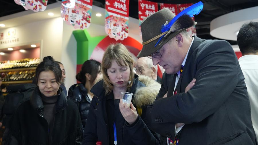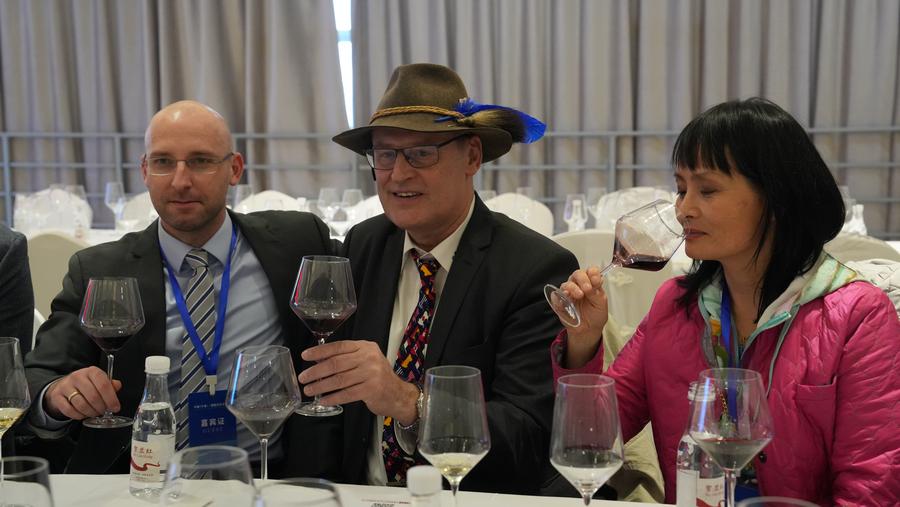 2月21日,德国企业代表在到访宁夏期间品尝贺兰山东麓葡萄酒。新华社记者 刘海 摄