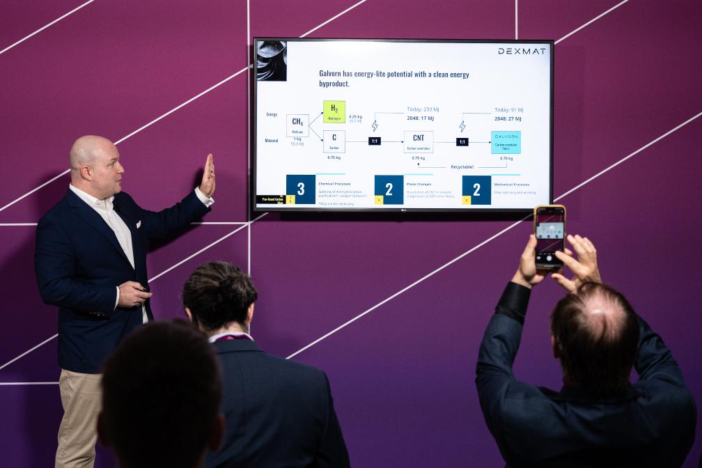 一家名为“DexMat”的公司展出了与美国赖斯大学合作研发的名为“加尔沃恩”(Galvorn)的碳纳米材料,这种碳纳米材料强度是钢的10倍,重量为铝的一半,弯曲寿命超过铜的100倍,不易燃且导电。据介绍,这种新材料可用于建筑、制造、电力等诸多行业。它目前的生产原料是甲烷,每吨甲烷可以生产750千克“加尔沃恩”和250千克氢气,因此其生产流程有助于减碳。不过,这种材料目前生产成本较高,该公司期望随着产量扩大成本能不断下降,几年后与高质量钢材成本持平。