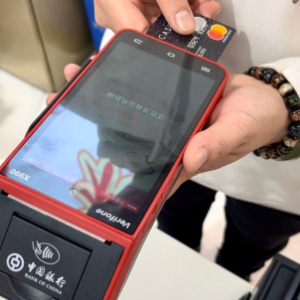 3月25日,北京首都机场,一位外籍人士使用万事达卡在机场一家纪念品商铺的中国银行POS机上成功进行刷卡支付。