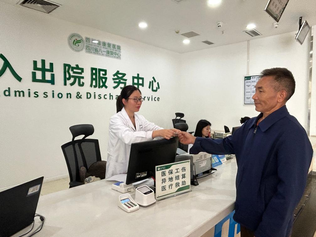 工伤人员兰先生(右)正在办理工伤保险跨省异地就医直接结算刷卡入院手续。(成都市社保局供图)