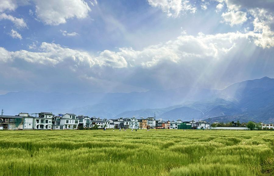 青瓦白墙、蓝天远山、风吹麦浪……在洱海之畔的喜洲古镇,一派田园风光,如诗如画。许多游客在此漫步、“打卡”拍照。