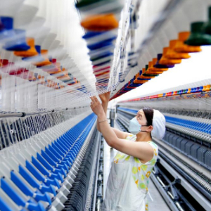 3月12日,在山东腾峰纺织科技有限公司,工作人员在智能化纺纱设备前忙碌。新华社记者郭绪雷摄