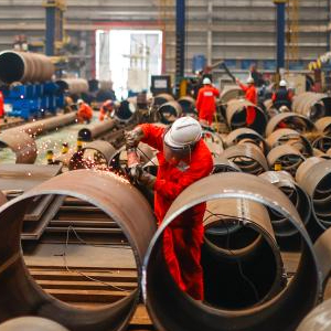 4月10日,在海油工程青岛建造场地,工人在建造现场进行钢材打磨作业。新华社发(杜鹏辉摄)