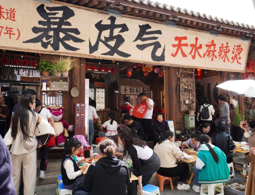 清明假期,天水市游客量持续增加。这是4月4日,游客在位于天水市秦州区的一家麻辣烫店吃麻辣烫。 新华社记者 马希平 摄