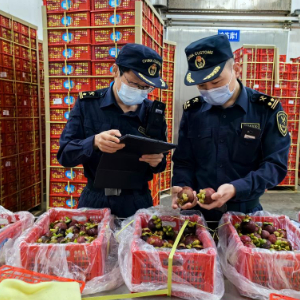 钦州港海关关员对进口山竹进行现场查验(2024年3月25日摄)。(李府阳 摄)
