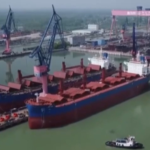 江苏扬州新大洋造船有限公司总经理 徐斌:今年到目前交付的9艘船中,有半数都是跟智能化和绿色能源相关的。采用甲醇、氨等清洁燃料的绿色船舶占比不断提升,比如我们刚交付的950箱支线集装箱船,就是采用绿色甲醇作为燃料。