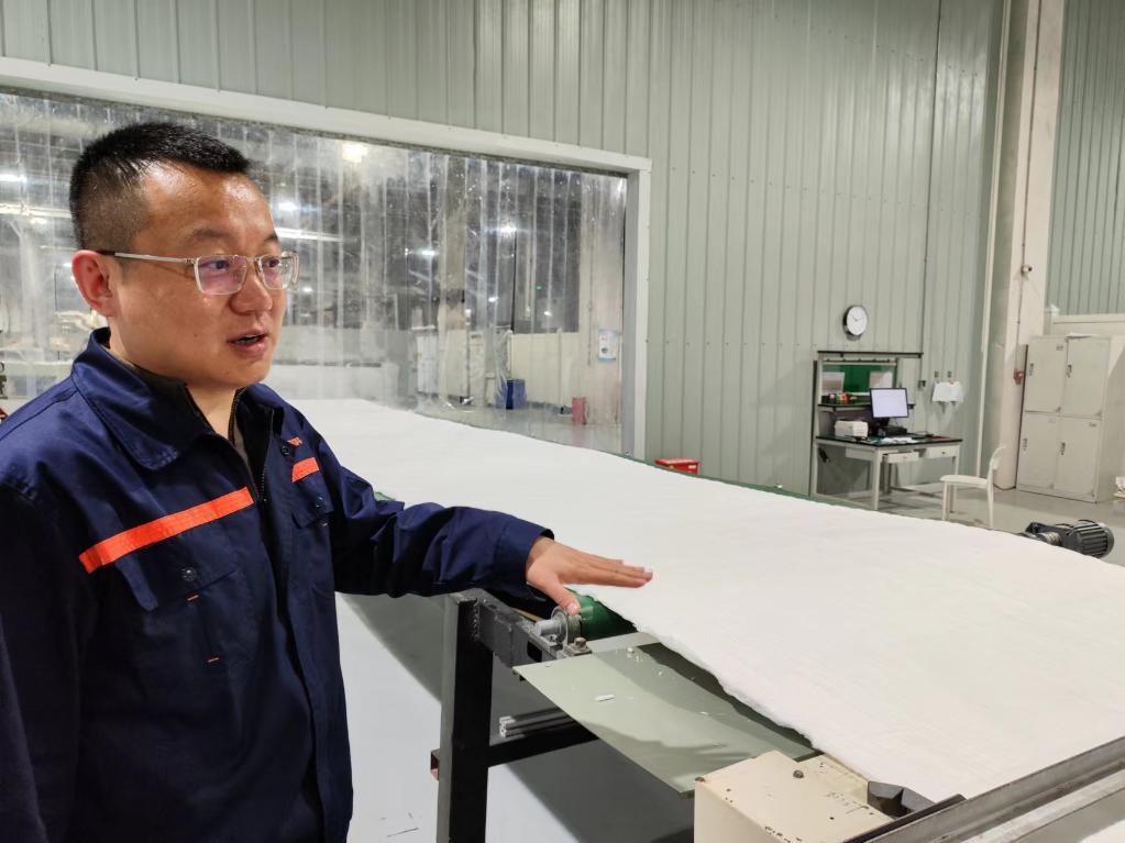 4月16日,上海榕融新材料技术有限公司厂长贾庆龙在企业生产车间查看氧化铝连续纤维针刺毯生产。新华社记者杨有宗 摄