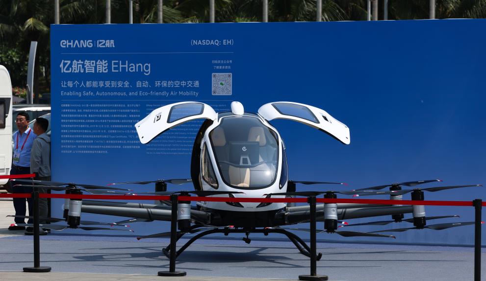 “8个轴、16个螺旋桨”,场馆外一架造型奇特的“无人机”引人关注,这是参展商亿航智能控股有限公司带来的一款无人驾驶载人航空器。该公司副总裁贺天星说,“我们刚刚获得全球首张无人驾驶载人航空器生产许可证,为新型无人驾驶航空器提供了一个适航标准和参考样本。”