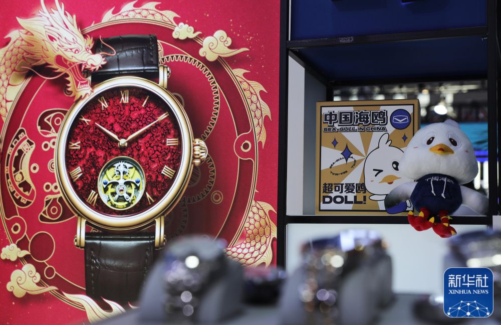 图为天津馆海鸥国潮风格手表展柜。本届消博会上,“老字号”带来的国潮新品不仅有着海派文化和传统文化元素,还与独具匠心的年轻创意相融合。新华社记者王楚天 摄