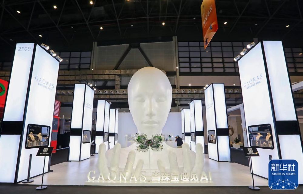 图为消博会珠宝展台高纳仕展台现场,高纳仕部分珠宝产品在设计中引入了AI算法。新华社记者王楚天 摄