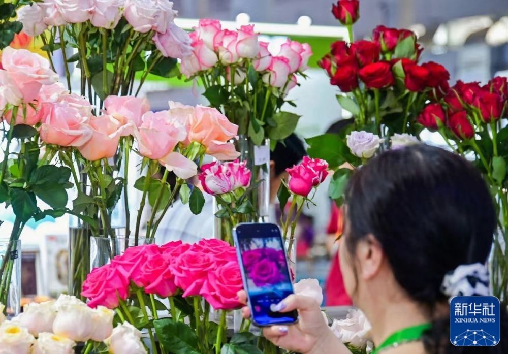 观众在国货特色潮品展区云南展台拍照,云南展台为本届消博会准备了8000余支、20多个品种的云南本土鲜切玫瑰。新华社记者王楚天 摄