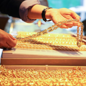 4月3日,营业员在浙江省湖州市德清县乾元镇一家金店整理黄金首饰。(倪立芳 摄)