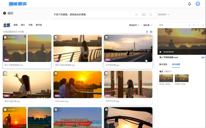 例如,在搜索框中输入“夕阳下的黄昏,是我逝去的青春”,以前的媒资系统是无法理解并找到相匹配的内容,但超融合智能媒资4.0不但可以理解这句话所表达的含义,而且能够在系统中找到与这句表述最为贴切的媒资。这就是自然语言搜索的魅力所在。