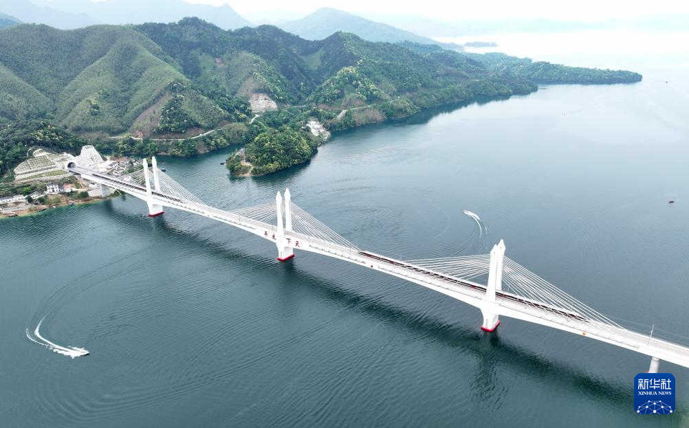 4月26日,列车驶过由中铁建大桥局承建的池黄高铁太平湖特大桥。新华社发(樊成柱摄)