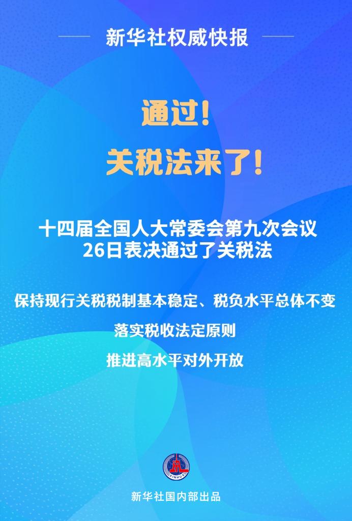 新华社北京4月26日电(记者申铖、邹多为)十四届全国人大常委会第九次会议26日表决通过了关税法,自2024年12月1日起施行。