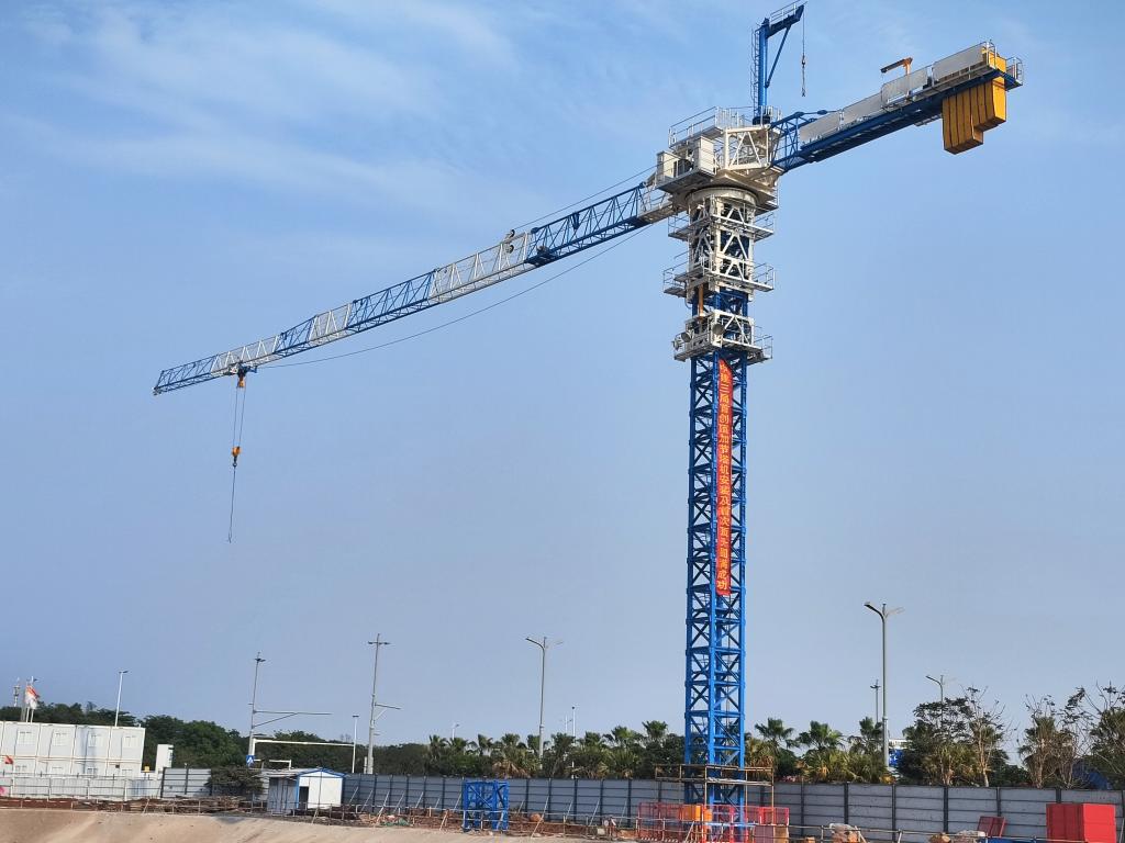 此外,该塔机采用攀爬式顶升设计,无需拆卸标准节即可实现两臂自由升降。“海南台风天气多发,极端天气下塔机的安全隐患是困扰我们许久的问题。在大风灾害天气来临前,该塔机的塔臂不用拆卸标准节即可实现快速自动化下降,如同电梯升降一般简单,有效地提升了设备的安全性。”中建三局海口航空特货“超级运营人”项目安全负责人任荣杰说道。