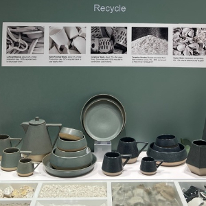 广东潮州市庆发陶瓷有限公司将牡蛎壳、碎瓷片回收重新加工,“变废为宝”制成精美工艺品;浙江爱仕达股份有限公司推出可拆卸手柄锅,在运输过程中,手柄可卸下置入锅内,减小产品体积、节省运费和包装材料;广东恒创陶瓷有限公司带来升级版陶瓷制品,经工艺改良,同款杯型比原先用料减少30%……