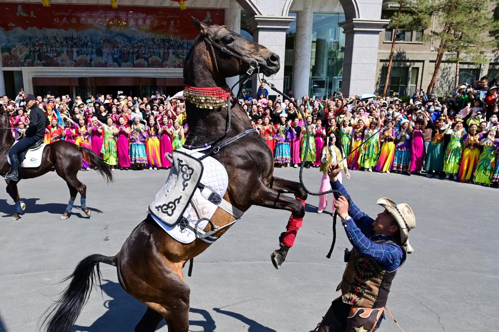 4月30日,在新疆乌鲁木齐市举行的巡游活动上,汗血宝马方阵为观众带来马术表演。新华社记者 丁磊 摄