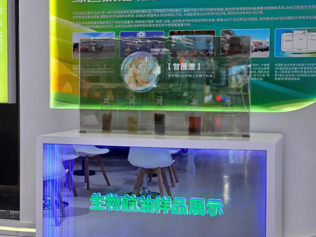 中国航油的展台展示的可持续航空燃料的原料。