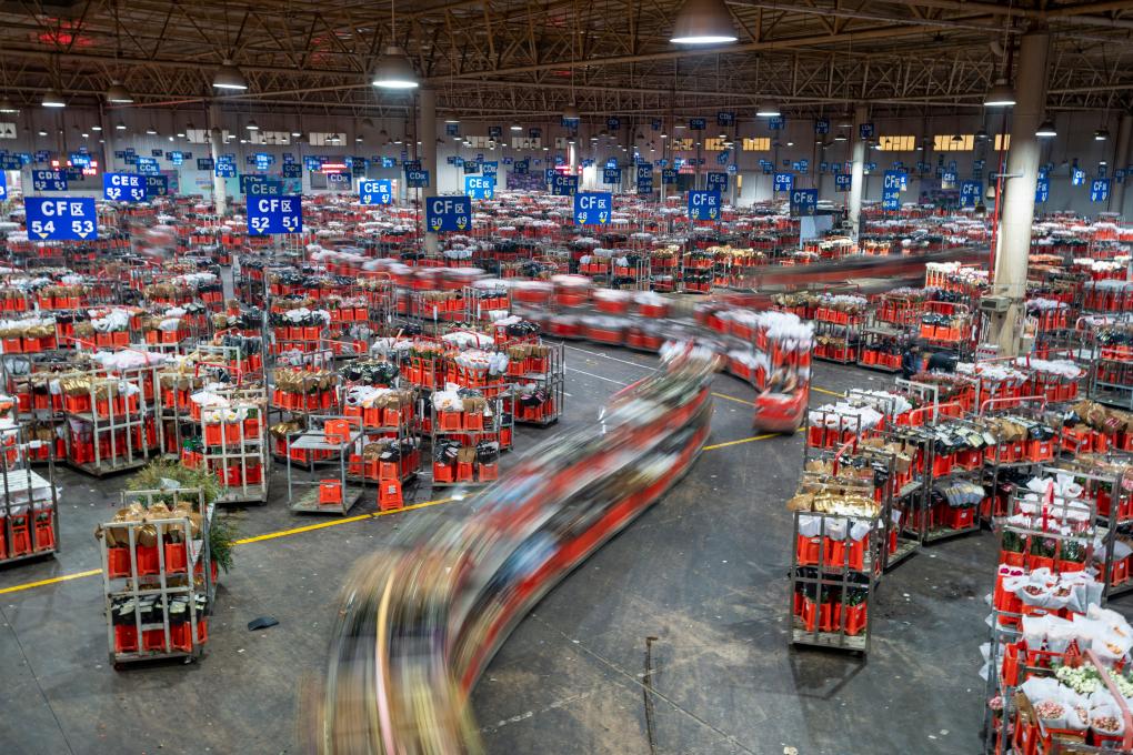 台车在昆明国际花卉拍卖交易中心运输鲜花(资料照片)。新华社记者 陈欣波 摄