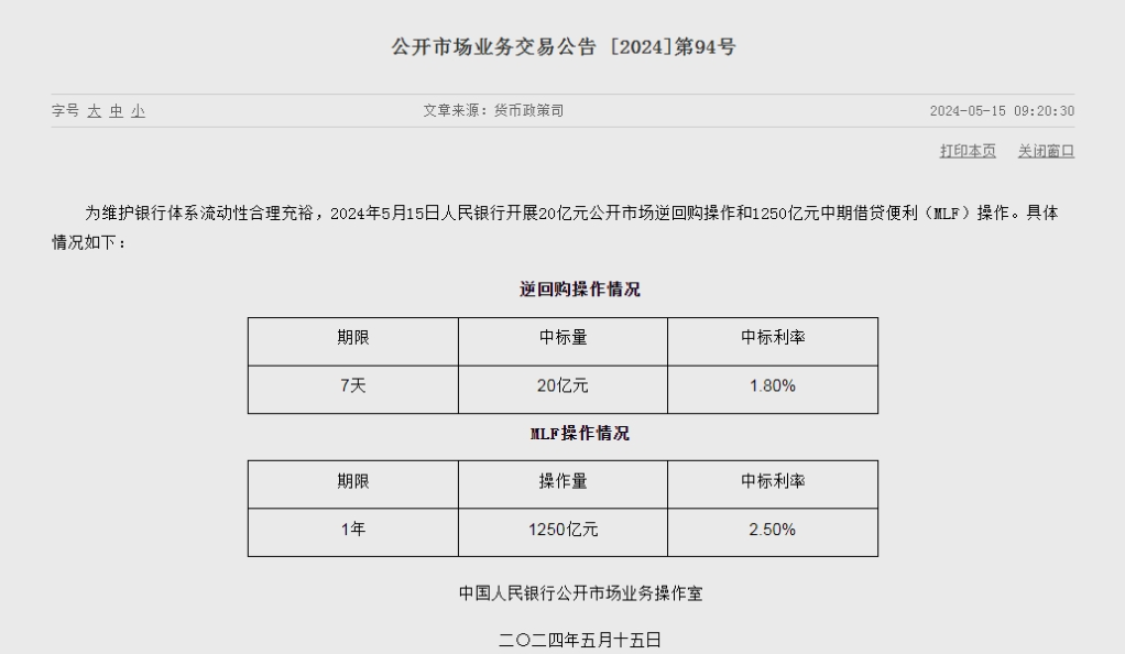 为维护银行体系流动性合理充裕,5月15日中国人民银行开展20亿元公开市场逆回购操作和1250亿元中期借贷便利(MLF)操作。