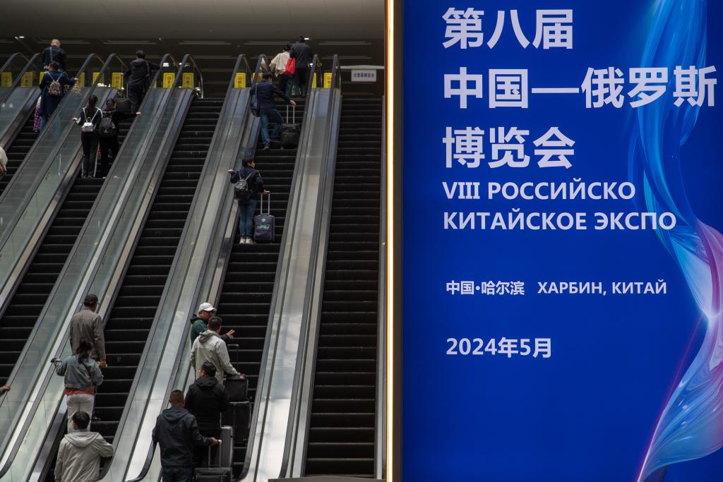这是5月14日拍摄的哈尔滨火车站南广场进站口处的展牌。新华社记者 张涛 摄