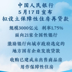 中国人民银行5月17日宣布,拟设立保障性住房再贷款。