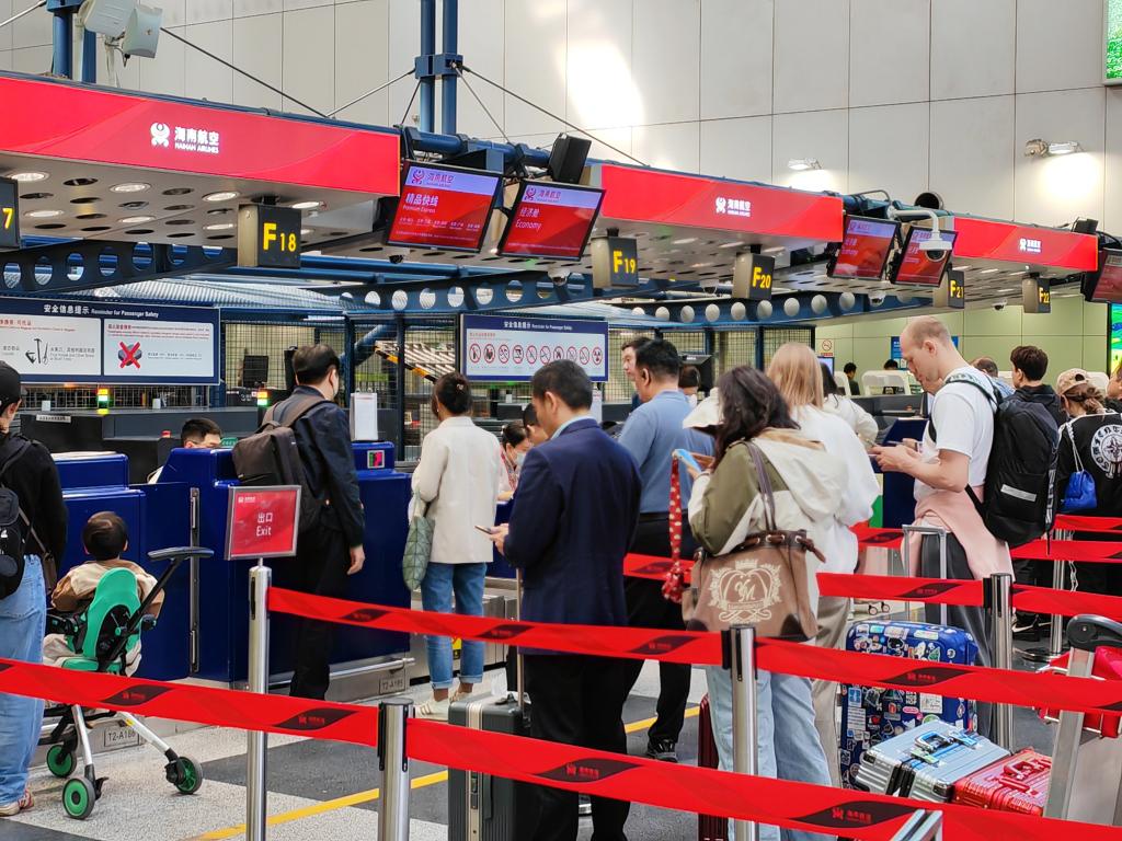 4月30日,首都机场T2航站楼,旅客正在排队办理乘机手续。新华社记者 王聿昊 摄