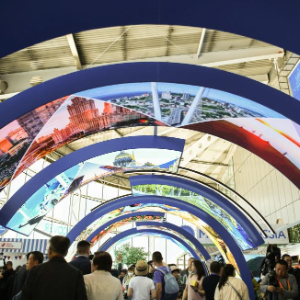 5月18日,参会者走进在哈尔滨国际会展中心举行的第八届中俄博览会展馆。新华社记者 王松 摄