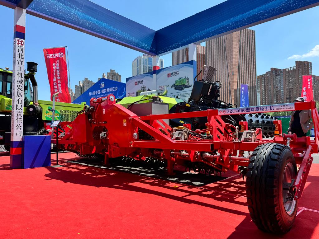 河北宣工机械发展有限责任公司今年首次参加中俄博览会,他们带来深耕粉碎松土机、全智能除草松土机等“庞然大物”参展。记者在该公司展位看到,约7米长的全智能除草松土机配备了除草齿液压驱动及控制系统,还配置苗带智能识别系统,可提高除草效率,同时减少对作物的物理损害,保护作物正常生长。
