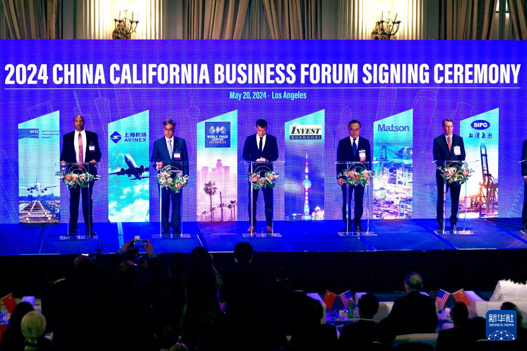 这是5月20日在美国加利福尼亚州洛杉矶拍摄的2024年中国—加州经贸论坛合作项目签约仪式现场。新华社发