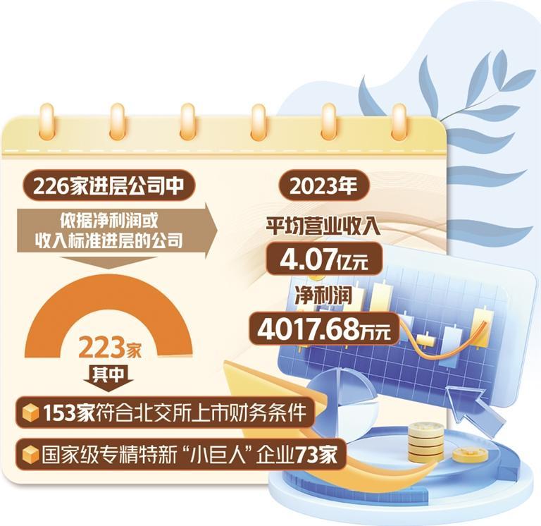 此批新进创新层的公司完成进层后,本年累计进层公司达298家,2023年平均实现营业收入4.17亿元,实现净利润4311.63万元,平均净资产收益率15.73%,近两年营业收入和净利润复合增长率分别为12.47%、20.06%。