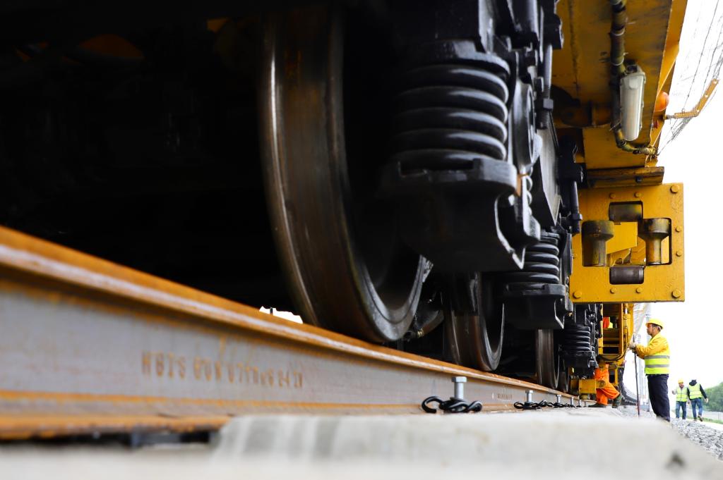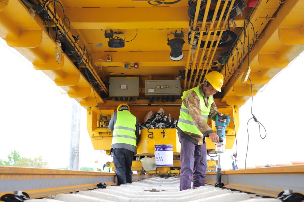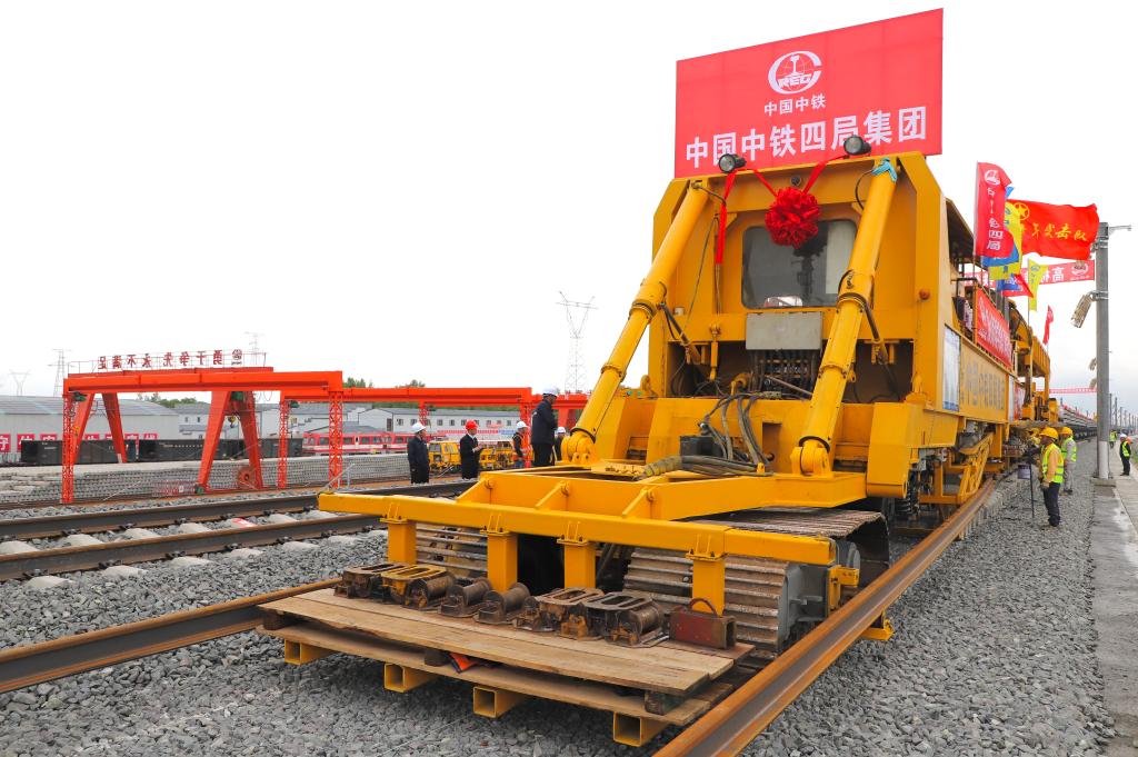5月28日,哈伊高铁铺轨施工作业现场。新华社记者 徐凯鑫 摄