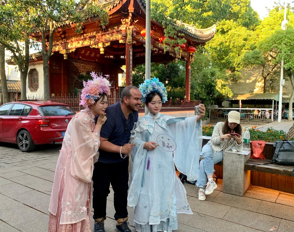 2024年5月8日,新华社古巴籍记者塞尔希奥·戈麦斯在苏州同里古镇和身着传统服饰的游客合影。新华社记者 张拓 摄