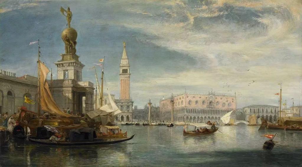 展览展出了《沉船浮标》《中式立柜》《意大利孩童》等多幅名家作品,其中,19世纪英国水彩画家詹姆斯·霍兰德所作《威尼斯总督府》吸引了许多观众,作品展现了意大利威尼斯地标性建筑圣马可广场及周围的景观,色彩干净明亮。这位享誉19世纪的英国水彩画家画作多以建筑和海洋为主题,创作了数百幅关于威尼斯的画作。