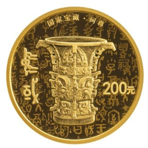 15克圆形金质纪念币背面图案为何尊造型,衬以何尊局部铭文并凸显铭文“中国”字样,并刊“国家宝藏·何尊”字样及面额。