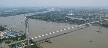 江苏南京,仙新路过江通道主桥建设中,创新应用中建五洲研发的抗疲劳正交异性钢桥面板,试验结果显示桥梁的使用寿命提高72%以上。