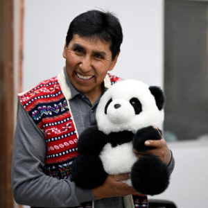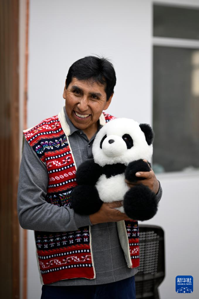 6月20日,在秘鲁阿雷基帕,手工艺人奥斯瓦尔多·马马尼展示羊驼毛制作的熊猫玩偶。新华社记者 李木子 摄