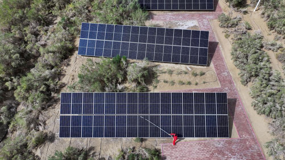 这是2023年8月20日拍摄的中国石油塔里木油田零碳沙漠公路光伏发电站(无人机照片)。新华社记者 王鹏 摄