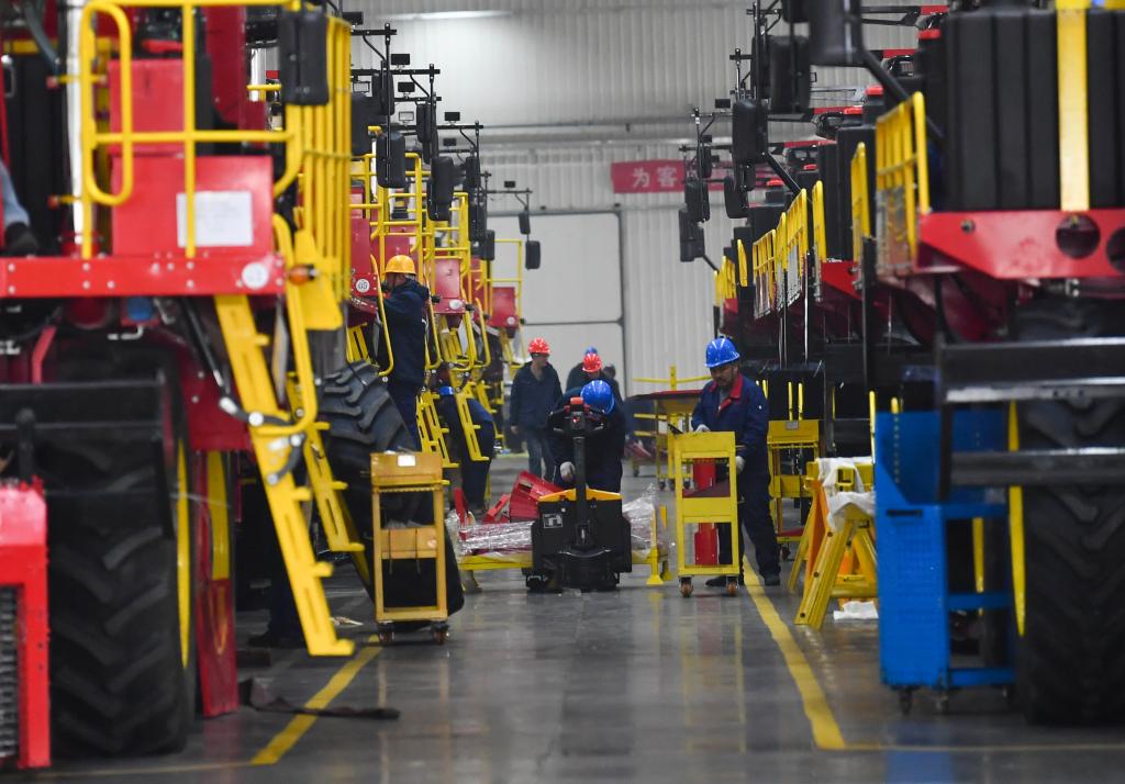 在新疆钵施然智能农机股份有限公司采棉机生产车间,工人在组装采棉机(2024年2月28日摄)。新华社记者 赵戈 摄