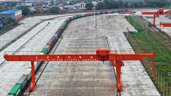7月1日在天津国际陆港拍摄的准备发车的中欧班列(无人机照片)。新华社记者李然摄
