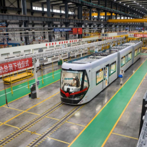 7月1日,在位于宜宾的中车铁投轨道交通产业基地生产车间,氢能源智轨电车总装下线(无人机照片)。(庄歌尔 摄)