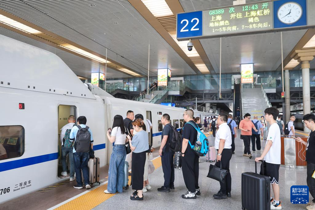 7月15日,旅客在南京南站乘坐G8389次高铁列车。新华社发(苏阳摄)