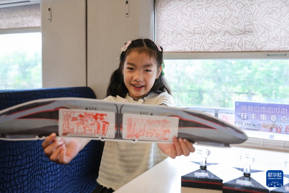 7月15日,一名小朋友在G8389次高铁列车上展示打卡印章。新华社发(苏阳摄)